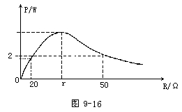 根据电源最大输出功率的条件做出输出功率与外电阻图(P-R图如图9-16所示)做定性分析,也可以得到同样的结果。由题意可知RA接入电路时,若电源的输出功率达到最大输出功率,则RB接入电路时,电源的输出功率肯定小于最大输出功率2W。若电源的输出功率没有达到最大输出功率,RB接入电路时,电源的输出功率有可能小于RA接入电路时输出功率2W。