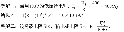 错解一是对欧姆定律使用不当,输送电压是加在输电线电阻和负载上的,如果把它考虑成输电线上的电压求电流强度当然就错了。错解二注意到了负载的作用,所求出的损失功率P1是正确的,然而在高压送电电路中,负载都是使用了变压器而错解二把它当作纯电阻使P2解错。