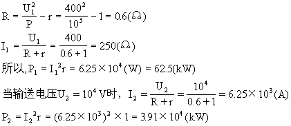 例13 输电线的电阻共计10Ω,输送的电功率是100kw,用400V的低压送电,输电线上发热损失的功率是多少kw?改用10kV的高压送电,发热功率损失又是多少kw?
