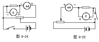 错解六:如图9-24所示,当变阻器的滑动头滑到最左端时,电键闭合后电源被短路,滑到最右端时,电流超过毫安表的最大量程,故连接错误。