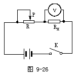 用伏安法测电阻,首先要判明电流表应该内接还是外接,由题目所给器材规格来看,显然不满足RA<<Rx条件,而是满足Rv>>Rx条件,所以应采用外接法。若图9-26电路,当滑动触头P处于最左端,滑动变阻器为最大值时,由题设条件流过电流表的电流