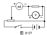 正确的连接图为图9-27所示。画图的关键是:毫安表需外接,变阻器接成分压电路。实验开始前将滑动变阻器的滑动触头滑至分压为零的位置。