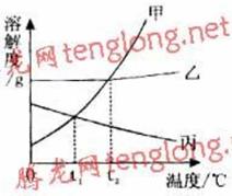 B、温度大于t2℃时,甲、乙、丙三种固体物质溶解度大小关系是甲>乙>丙。
