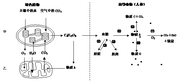 (5)发生在高等动物细胞结构乙中的生理过程是(填序号)_______,在缺氧情况下,物质A可通过⑥过程形成物质B(填名称)___________。