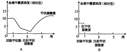 (9)若将C组其中一只兔子的甲状腺切除,并从第三周开始每天注射适量的甲状腺激素,则该兔子血液中甲状腺激素含量的变化如下图(A)所示。请在下图(B)中用虚线画出1-5周内促甲状腺激素在血液中含量的变化曲线。(2分)