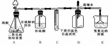 ②装置D中胶头滴管中的蒸馏水在二氧化硫气体生成之前滴到蓝色石蕊试纸上,未见试纸颜色发生变化,当有二氧化硫气体通过时发现湿润的蓝色石蕊试纸变红,此现象说明 。