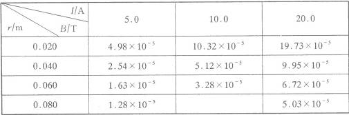 (2)某同学在研究长直导线周围的磁场时,为增大电流,用多根长直导线捆在一起进行实验.他不断改变导线中的总电流I和测试点与直导线的垂直距离r,测得的数据如下表所示(但遗漏了一个数据):