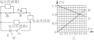 11.(12分).为了测定电源电动势E、内电阻r和电阻R0.某同学利用DIS设计了如图甲所示的电路.闭合开关S0将滑动变阻器的滑动触头P向某一方向移动,用电压传感器1、电压传感器2和电流传感器测得数据,并根据测量数据利用计算机分别描绘了如图乙所示的M、N两条U-I图线.请你回答下列问题: