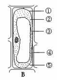 (3)在探究“植物细胞的吸水和失水”活动中,B图为实验过程中加清水后观察到的一个细胞示意图,该细胞的原生质层由其中的 ▲ 组成(填写序号),此时细胞处于 ▲ 过程中。