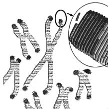 端粒(右图中染色体两端所示)通常是由富含鸟嘌呤核苷酸(G)的短的串联重复序列组成。它们能防止不同染色体末端发生错误融合。但是,细胞每分裂一次,端粒就会丢失一部分;在细胞衰老过程中端粒逐渐变小。端粒酶可利用某段RNA序列作为模板合成端粒DNA,对端粒有延伸作用。
