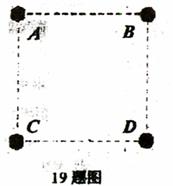 四个质量均为m的质点A、B、C、D组成一边长为a的正方形,如19题图所示。如果质点之间仅存在万有引力的作用,为使此系统保持稳定,四个质点应皆以角速度ω绕通过它们的中心并垂直于正方形平面的轴旋转,试用质量m、边长为a以及万有引力常量G表示此角速度ω的大小。