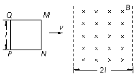 (10分)如图所示,用质量为m、电阻为R的均匀导线做成边长为l的单匝正方形线框MNPQ,线框每一边的电阻都相等。将线框置于光滑绝缘的水平面上。在线框的右侧存在竖直方向的有界匀强磁场,磁场边界间的距离为2l,磁感应强度为B。在垂直MN边的水平拉力作用下,线框以垂直磁场边界的速度v匀速穿过磁场。在运动过程中线框平面水平,且MN边与磁场的边界平行。求