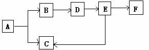 (5分)A-F均为初中常见的物质,它们相互间的反应均为初中常见反应。C为气态,F为紫红色固体,A、D、B的相对分子质量依次增大。 “ ”表示物质间存在转化关系(部分生成物和反应条件已略去)。