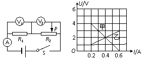 5.下左图电路中,R1为定值电阻,R2为滑动变阻器。闭合电键S,将滑动触头P从最右端滑到最左端过程中,两只电压表的示数随电路中电流变化的完整过程图线如下右图所示。下列判断正确的是
