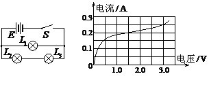 6.下左图所示电路中,电源电动势为3.0V,内阻不计,L1、L2、L3为3个相同规格的小灯泡,这种小灯泡的伏安特性曲线如下右图所示。开关S闭合后下列判断正确的是