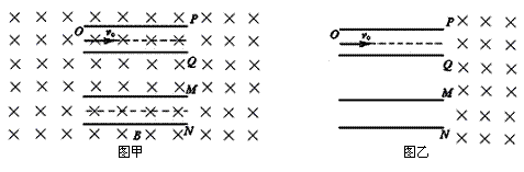 19.(实验班做)如图甲所示,两个几何形状完全相同的平行板电容器PQ和MN,水平置于水平方向的匀强磁场中(磁场区域足够大),两电容器极板的左端和右端分别在同一竖直线上,已知P、Q之间和M、N之间的距离都是d,极板厚度不计,板间电压都是U,两电容器的极板长相等。今有一电子从极板PQ中轴线左边缘的O点,以速度v0沿其中轴线进入电容器,做匀速运动。此后经过磁场偏转又沿水平方向进入到电容器MN之间,且沿MN的中轴线做匀速运动,再经过磁场偏转又通过O点沿水平方向进入电容器PQ之间,如此循环往复。已知电子质量为m,电荷量为e。不计电容之外的电场对电子运动的影响。