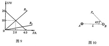 12.如图10所示,A、B为带等量异种电荷的两个点电荷,电荷量都是Q,相距为L。电场中的P点与两个点电荷的距离相等,PB与AB的夹角为45°,则P点的电场强度大小