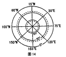 (4)请在图14中画出该日北京时间9点时的地球太阳光照示意图。