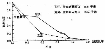 图16是长江、黄河部分河段的纵剖面示意图。图中高度比率是指河流落差与总落差之比;距离比率是指河段长度与总长度之比。读图回答下列