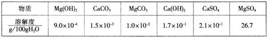 20.某自来水中含有Ca2+、Mg2+、Na+、K+、HCO3-、SO42-、Cl-,长期烧煮上述自来水会在锅炉内形成水垢。锅炉水垢不仅耗费燃料,而且有烧坏锅炉的危险,因此要定期清除锅炉水垢。已知部分物质20℃时的溶解度数据为