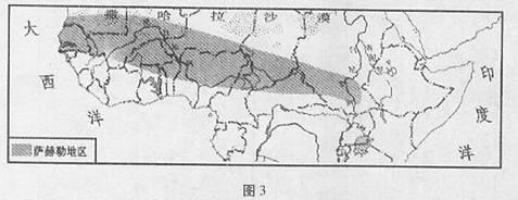 图3中阴影表示非洲北部萨赫勒地区(撒哈拉沙漠南部向热带草原过渡的干旱、半干旱地带),当地牧民每年赶着大量牲畜于11月南迁,6月北移,近年来该地区植被退化严重。