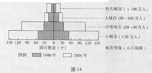 A.1980年全国中等城市大约有30个 B.城市等级越高数目越多