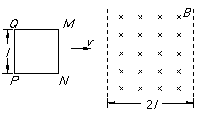 (10分)如图所示,用质量为m、电阻为R的均匀导线做成边长为l的单匝正方形线框MNPQ,线框每一边的电阻都相等。将线框置于光滑绝缘的水平面上。在线框的右侧存在竖直方向的有界匀强磁场,磁场边界间的距离为2l,磁感应强度为B。在垂直MN边的水平拉力作用下,线框以垂直磁场边界的速度v匀速穿过磁场。在运动过程中线框平面水平,且MN边与磁场的边界平行。求