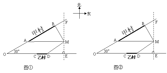 如图,甲、乙两村坐落在夹角为30°的两条公路的AB段和CD段(村子和公路的宽均不计),点M表示这所中学。点B在点M的北偏西30°的3km处,点A在点M的正西方向,点D在点M的南偏西60°的