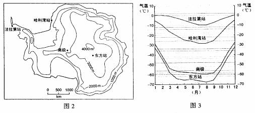 读“南极洲等高线图”(图2)和“南极洲4个气象站气温曲线图”(图3),回答4-6题。