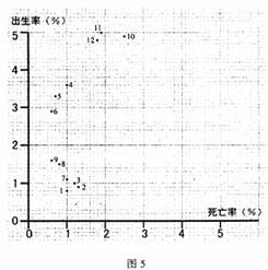 读“不同国家出生率、死亡率统计图”(图5),图中1-12代表国家。回答10-12题。