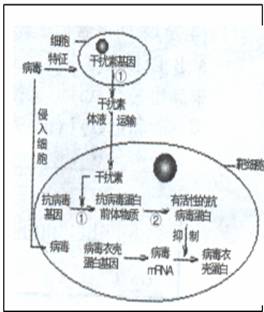 一类具有很高生物活性的糖蛋白,它具下图为干扰素抑制病毒增殖过程示意。