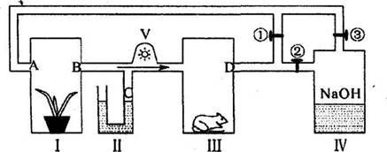 (14分)下图Ⅰ中放一盆正常生长的大豆,Ⅱ处为一U型管,Ⅲ处放一只健康的小白鼠,Ⅴ使装置中的空气以一定速度按箭头方向流动。根据装置图分析回答问题。