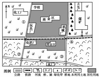(1)该城镇欲依托矿产资源,调整工业结构,发展循环经济,你认为最适宜在该城镇布局的工厂是 ( )