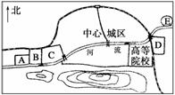 5.(2007·全国文综Ⅱ)某城市将建印染厂、水厂、污水处理厂、科技园区和生态公园。下图中的A、B、C、D、E五处可供选址,该地盛行东风。据此并读下图,回答问题。