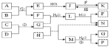 已知:E为红棕色固体,K为浅绿色溶液;反应①、②都是化工生产中的重要反应;B、C、D、H是单质;B、C、D、F、G、H常温下是气态; F、P 和H的水溶液均具有漂白作用,且F是形成酸雨的主要物质之一;N是一种常见的氮肥;化合物G分子构型为三角锥形,化合物M由两种元素组成,分子内共有58个电子。