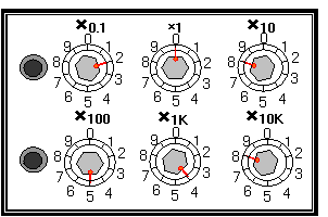 右图中的电阻箱有6个旋钮,每个旋钮上方都标有倍率,将每个旋钮上指针所指的数值(都为整数)乘以各自的倍率,从最高位依次往下读,即可得到这时电阻箱的实际阻值。图中最左边的两个黑点是接线柱。若指针所示如图,则阻值为84580.2Ω。