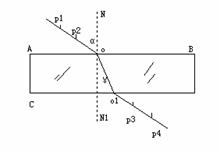 实验原理:如图所示,入射光线AO由空气射入玻璃砖,经OO1后由O1B方向射出。作出法线NN1,则折射率