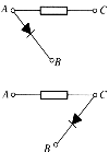 ⑵用欧姆挡测量,A、C间正、反接阻值不变,说明A、C间有一个电阻。⑶用欧姆挡测量,黑表笔接A红表笔接B时测得的阻值较小,反接时测得的阻值较大,说明箱内有一个二极管,可能在AB间,也可能在BC间,如右图中两种可能。