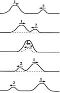 在一根水平长绳的两端分别向上抖动一下,就分别右两个凸起状态1和2在绳上相向传播。它们在相遇后,彼此穿过,都保持各自的运动状态继续传播,彼此都没有受到影响。
