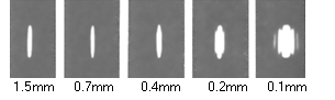 从图中看出:当狭缝宽度在0.5mm以上时,缝越窄亮斑也越窄;当狭缝宽度在0.5mm一下时,缝越窄中央亮条越宽,整个亮斑范围越宽,亮纹间距越大。