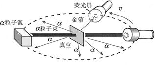 全部装置放在真空中。荧光屏可以沿着图中虚线转动,用来统计向不同方向散射的粒子的数目。观察结果是,绝大多数α粒子穿过金箔后基本上仍沿原来方向前进,但是有少数α粒子发生了较大的偏转。