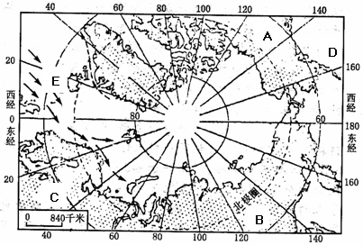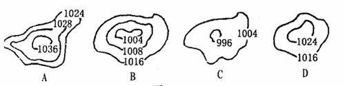 (1)图中A、B、C三个字母所处的气压带同为副极地低气压,如果此时该气压带被切断,使其成为块状气压中心保留在海洋上,其气压中心之一留在E岛附近,另一气压中心在D附近。下面四幅等压线图中,最能正确反映此时B点所在大陆气压中心的是 ( ) (1分)