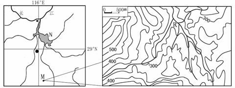 42.(10分)图1示意我国某区域的水系分布。某学校研究性学习小组对图1中的M地进行实地考察,并查阅了相关资料,发现近三十年来M地生态环境明显改善。图2示意M地的等高线分布,表1示意M地的土地利用结构变化,读图表回答问题: