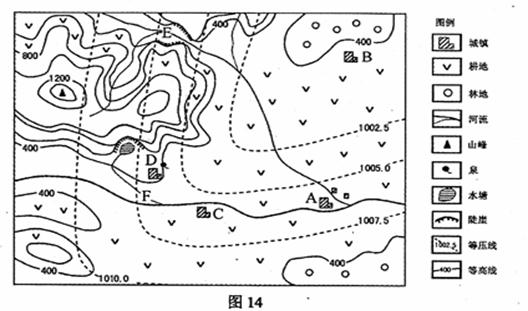 44.(9分)图14是我国某地区地形等高线及某时刻海平面等压线图。读图回答下列问题。
