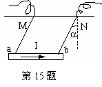 质量为m ,长为L的的金属棒ab用两根细金属丝悬挂在绝缘架MN下面,整个装置处在竖直方向的匀强磁场中,当金属棒通以由a向b的电流I后,将离开原位置向前偏转α角而重新平衡,如图。求磁感应强度B的方向和大小。