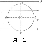 3.如图所示,有一根直导线上通以恒定电流I,方向垂直指向纸内,且和匀强磁场B垂直,则在图中圆周上,磁感应强度数值最大的点是 ( )