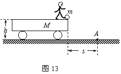17.(10分)如图13所示,一平板车静止在光滑水平面上,一人静止站立在车上,已知平板车和人的总质量为M,平板车的高度为h,在平板车右端另外放一质量为m且与车无摩擦的小球,若人将小球向右踢出,使小球恰好落在地面上的A点,此时移动后的平板车右端距离A点的水平距离为s,人相对于平板车始终静止。求: