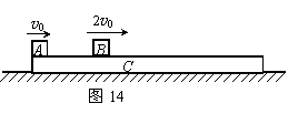 18.(12分)如图14所示,C是放在光滑的水平面上的一块木板,木板的质量为3m,在木板的上面有两块质量均为m的小木块A和B,它们与木板间的动摩擦因数均为μ;最初木板静止,A、B两木块同时分别以方向水平向右的初速度v0和2v0在木板上滑动,木板足够长,A、B始终未滑离木板。求: