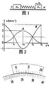 如图1所示,一轻弹簧的两端与质量分别为m1和m2的两物块A、B相连接,并静止在光滑的水平面上。现使B获得水平向右的瞬时速度3m/s,以此刻为计时起点,两物块的速度、随时间变化的规律如图2所示,从图象信息可得