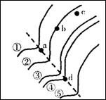 读北半球某地等风速线示意图,且①>②>③>④>⑤,回答7-8题。